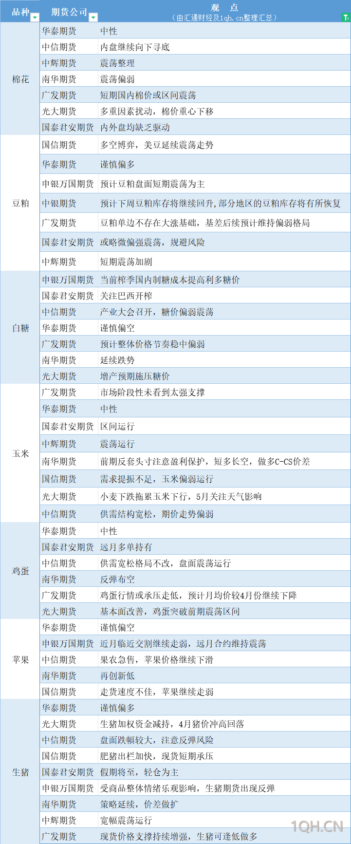 期货公司观点汇总一张图:4月29日农产品(棉花、豆粕、白糖、玉米、鸡蛋、生猪等)