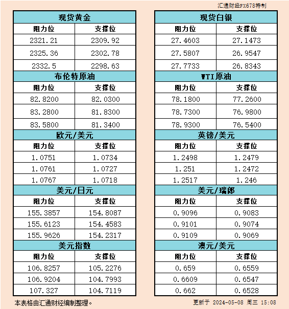 5月8日欧市支撑阻力:金银原油+美元指数等六大货币对
