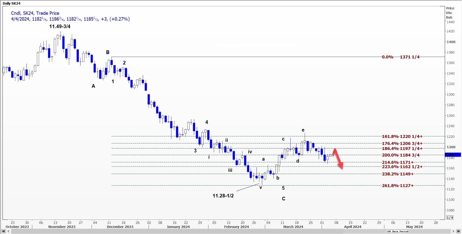 芝加哥期货交易所(CBOT)大豆SK24期货可能测试每蒲式耳11.88美元的阻力位,突破该水平后可能上涨至11.9225美元至11.9975美元的区间。
