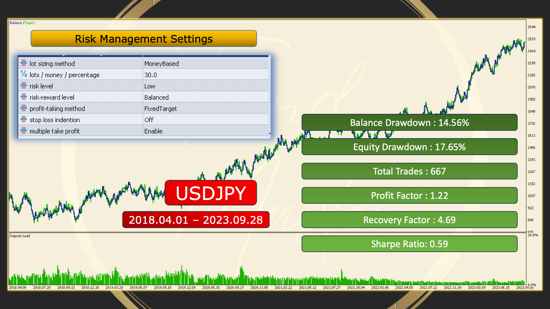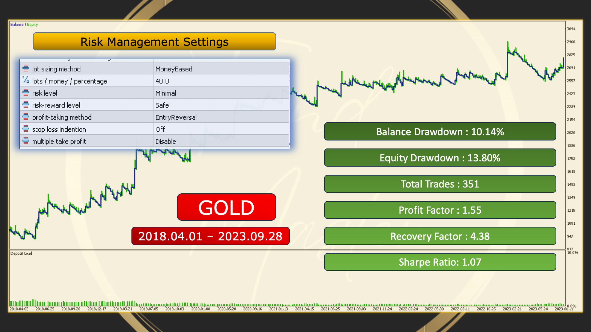 To backtest, follow these steps: Download the set files, then open MetaTrader, attach the EA to any chart, click "Load" on the Input tab, navigate to the download folder and set file, open the Strategy Tester, and copy the settings from the Input tab. For faster testing, choose "Modeling: Open Price Only." The test should be conducted from 2018.04.01 to 2023.09.28, with a standard account balance of $1000, and then start the test.