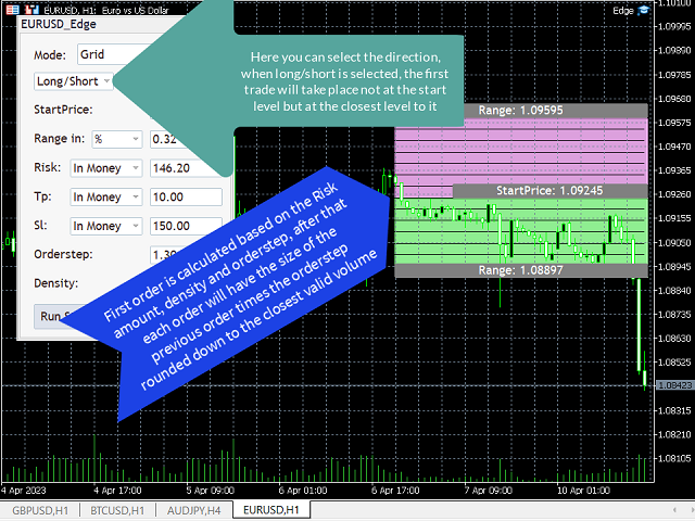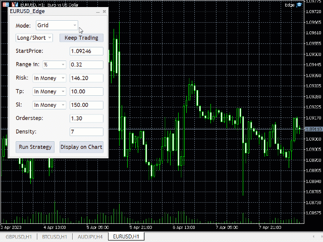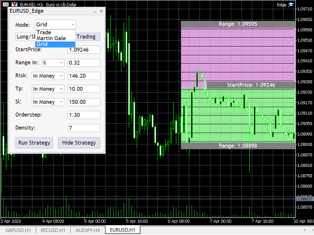 2. Grid: The selection box displays "Long/Short" by default, allowing you to choose the direction for trading. If Long/Short is selected, the strategy will decide the direction based on whether the price goes up or down from the Startprice. If the price goes up, it will take only short trades, and if it goes down, it will take only long trades. The "Stop at Close" Selection Box allows you to decide whether the strategy should stop after a profit or continue with the ask price as the Startprice, or if "Status Quo" is selected, the strategy will restart and remain the same after it closes out with profits. The Startprice parameter is the level that needs to be reached before the strategy starts trading. If the selected direction is Long only or Short only, the first trade will take place at this level. If the direction is Long/Short, the first trade will take place at the next level in the grid, at a distance of Range/Density from the Startprice, after the Startprice is reached. The Range parameter can be set in price, points, or as a percentage of the Startprice. This is the interval above or below the Startprice at which the grid strategy will take trades, assuming that the price will make a retracement before continuing in the same direction. The Volume parameter determines the amount of money/lots available for the strategy. The Volume can be given in lot amount, money amount, or as a percentage of the account balance. The Takeprofit and Stoploss parameters can be set in money amount or as a percentage of the balance. If all information is filled out and the Stoploss parameter is left blank, the EA will automatically calculate an ideal Stoploss (Range/Density above or below the Range). The Orderstep parameter is the multiplier between the size of the orders. The Density parameter determines the number of trades that will take place in the Range. If you want to see a visual representation of the strategy, you can display it on the chart. You can start the strategy by clicking the "Run Strategy" button, which can also be used to stop the strategy or change the Takeprofit or Stoploss parameters later. Note that after running the strategy, the volume parameter may change, as the strategy may not use all of the volume given by the user. The parameters of the strategy displayed on the panel are the parameters set when starting the strategy. When the strategy is running and you select the Grid layout, the panel will display information about the current strategy.