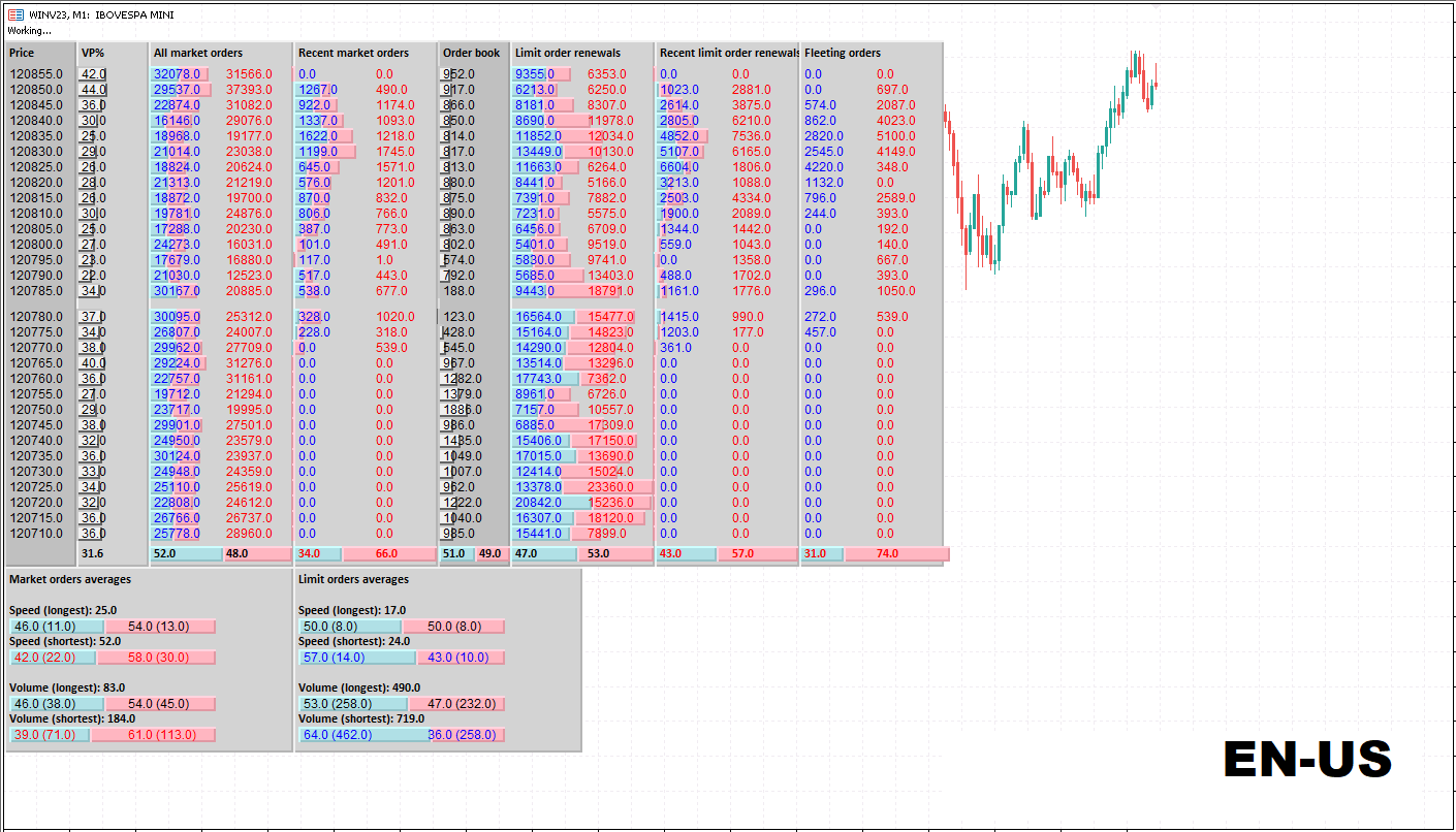- speed and volume averages (customizable parameters) of market orders with percentage comparison;