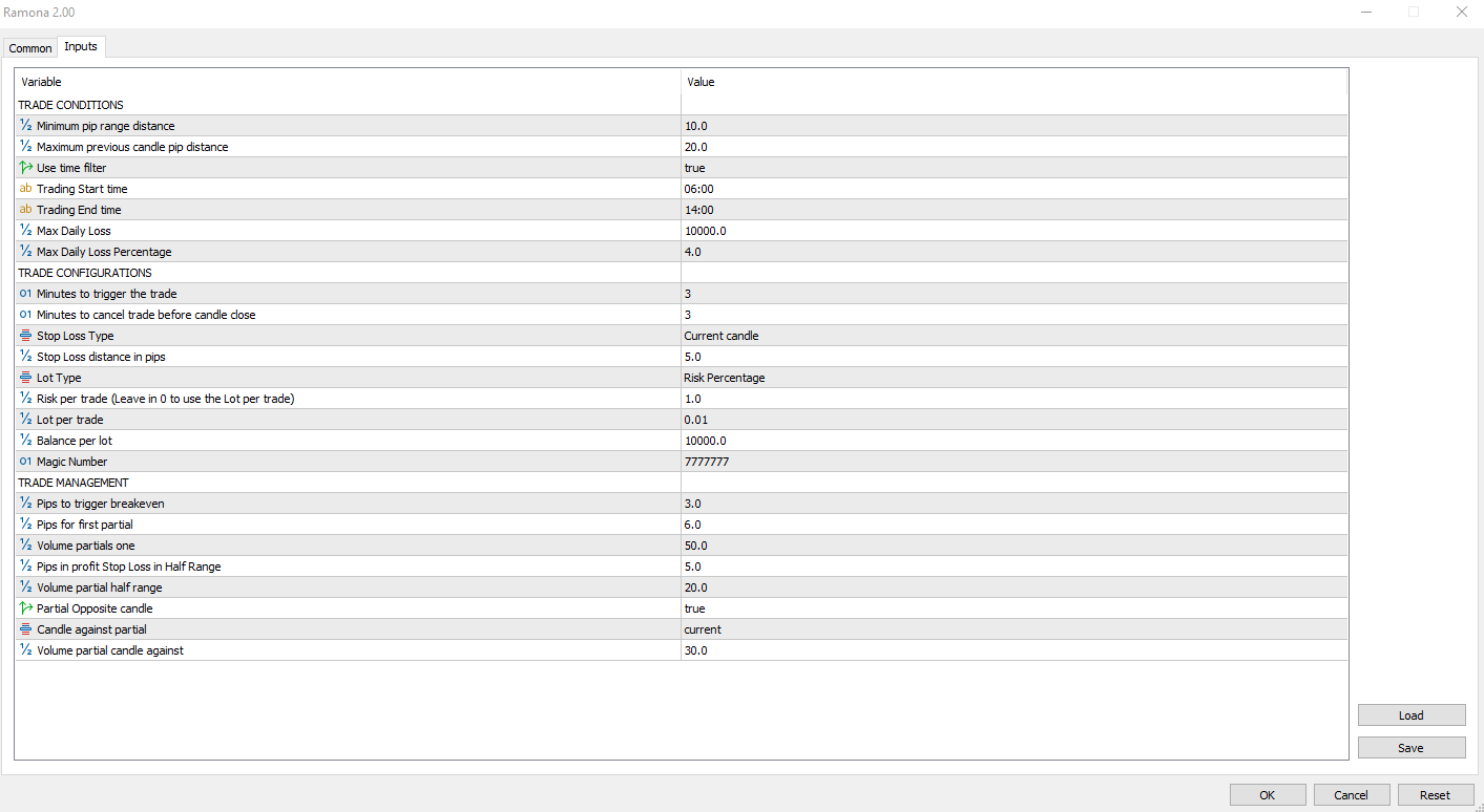 1) Min Pip range distance: This setting determines the minimum pip range required before Ramona initiates a trade. By specifying a minimum threshold, it ensures that trades are only taken when there is sufficient price movement to capitalize on potential breakouts.