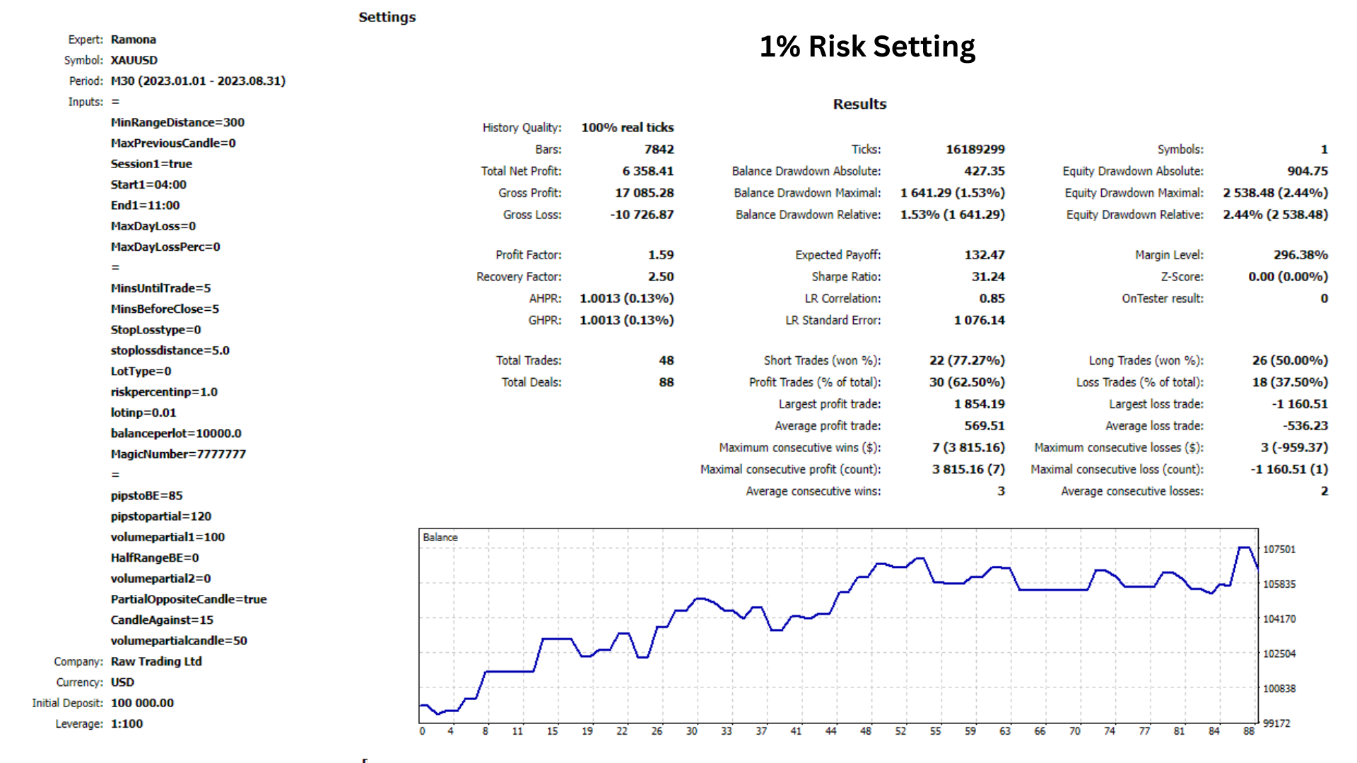 To further empower traders like you, Ramona features a comprehensive trade management tool that allows you to customize your trades according to your preferences. You can conveniently close partials,to manage risks effectively or take partial profits when opportunities arise. Moreover,a trade time filter is provided so that you have full control over when the bot executes trades.Additionally,the "minutes-to-trigger" feature ensures that only optimal setups are taken; avoiding immediate breakouts from previous highs. In fact, a safer market order setup upon new candle openings is also under development. So stay tuned!