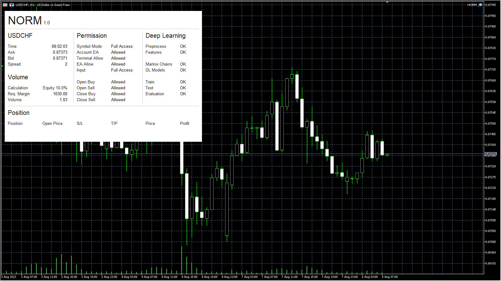 Welcome to NORM, an Expert Advisor (EA) employing Artificial Intelligence technology to elevate your trading experience. Through AI-powered trading and the integration of Markov Chains, NORM captures intricate market patterns and identifies trends accurately.• Predictive accuracy through AI-powered trading .• Capturing complex market patterns with Markov Chains .• Rapid adaptation to new market conditions via Deep Learning .