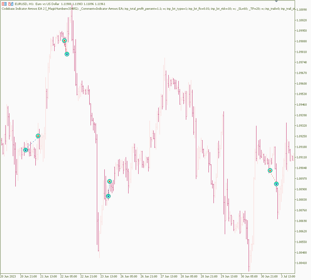 1. 检查条件:箭头的存在和DeMarker的水平。2. 如果前一个箭头向下,而当前箭头表示买入信号(向上),并且DeMarker低于超卖水平(例如,低于30),那么买入头寸将被打开。3. 如果前一个箭头是向上的,而当前箭头表示卖出信号(下跌),并且DeMarker高于超买水平(例如,高于70),那么卖出头寸将被打开。4. 平仓时,将计算盈利或亏损。