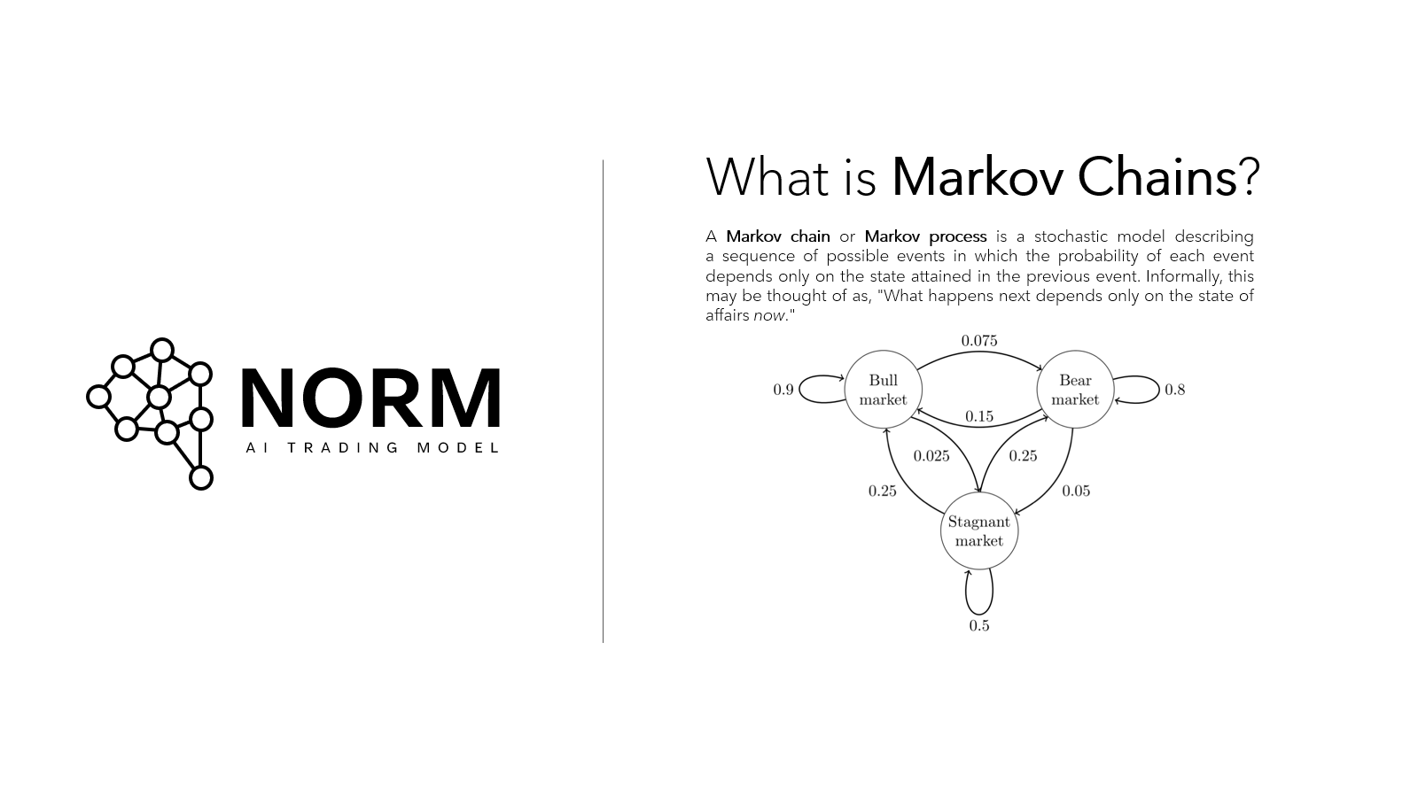 In parallel, Markov Chains enhance NORM's understanding of transitions between market states. These chains illustrate how the market evolves over time, with future states influenced by the current state. NORM employs this insight to anticipate shifts between different price levels or market conditions.