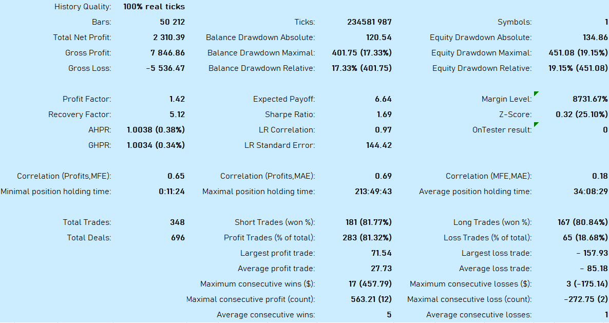 This expert advisor does not use any dangerous strategy, such as martingale or grid, which can lead to the total loss of the account . Using this expert conservatively (1% risk per operation) should not have a loss of more than 20% of the total account.