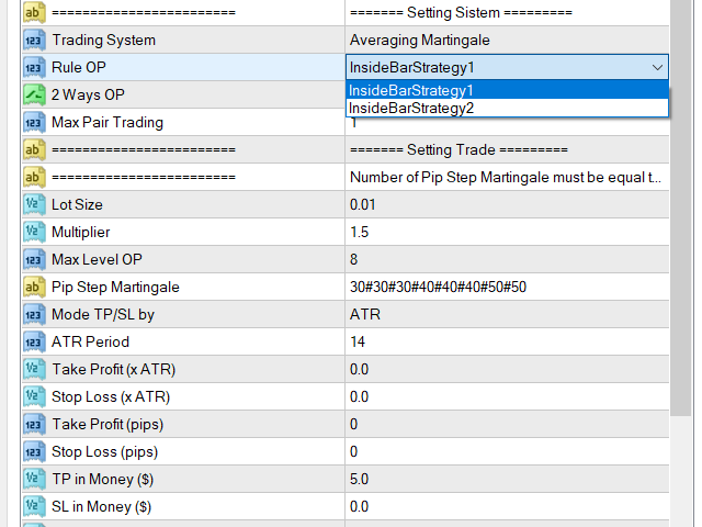 3. 設置交易可調點步鞅可調但:“Pip Step Martingale 的數量必須等於 Max Level OP”批量乘數按 ATR / 點數 / 資金 ($) 的模式獲利/止損