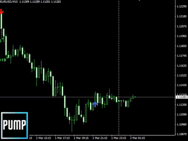 - A buy signal - a big blue arrow ⬆, a confirming blue arrow pointing to the right ➡, is the best level to enter - open a Buy order.