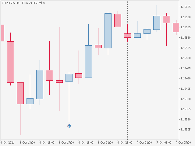 The indicator is based on the Pin-bar candle pattern. The size of the nose and body of the candle can be adjusted in the settings.
